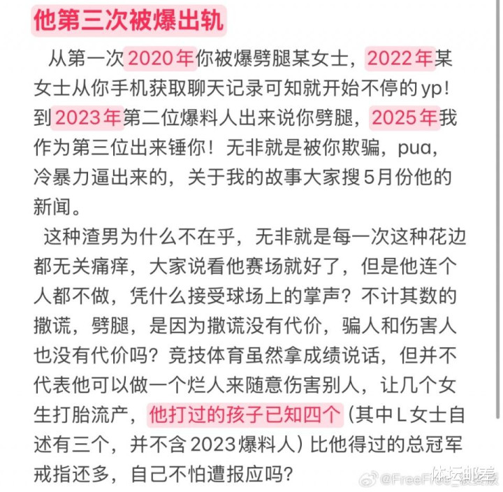 根据这位女网友曝光出来的社交动态,她直言徐杰连个人都不做,凭什么接受球场上的掌声?不计其数的撒谎、劈腿,难道是因为撒谎没有代价,骗人和伤害人也没有代价吗?竞技体育虽然拿成绩说话,但并不代表他可以做一个烂人来随意伤害别人。让几个女生打胎流产,他打过的孩子已知4个,其中L女士自述有3个;并不含2023年爆料,人比他得过的总冠军戒指还多,自己不怕遭报应吗?