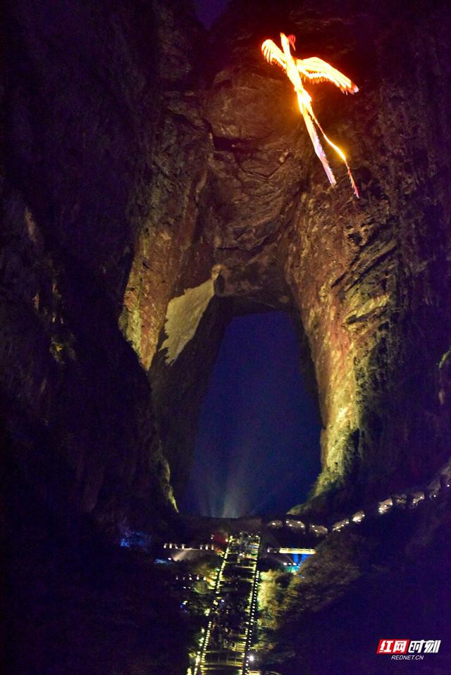 从白昼到深夜,三场主题演绎在天门山广场轮番登场,将节日氛围一次次推向高潮。上午10时,音乐声中,一声“飞天凤凰来啦”的欢呼划破长空——一架6米长的飞天凤凰从广场盘旋而起,金红交织的光影在羽翼间流转,宛如真凤凰翱翔天际。它绕广场划出两道圆弧,尾羽轻扫游客头顶,随后沿青灰色山脊线攀升,向着天门洞口飞去。“凤凰来,福气来”,承载着满满祝福的飞天凤凰,引得游客举着手机追拍轨迹,小朋友蹦跳欢呼,目光里满是欢喜。