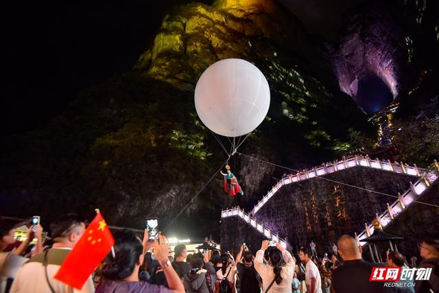 此时,国庆中秋特别节目“仙女散花”登场。天门洞广场中央,一名身着青红古典衣裙的“舞者”随氦气球缓缓升起,彩虹天梯的光线下,裙摆泛着淡淡光泽,脚尖轻点如踩“云端”。升至高空后,“舞者”展开双臂,捻起彩色花瓣向游客撒下,大家兴奋伸手承接这份“飞天祝福”。氦气球缓缓下降时,“仙女”还将花瓣轻轻放在小朋友掌心,惹得孩子举着花瓣蹦跳欢呼。最后一把花瓣撒落,彩虹天梯灯影流转,花瓣飘落在老人肩头、年轻人发梢、小朋友手心,大家举着花瓣欢笑交流,将天门山的夜色灵动与节日祝福一并珍藏。
