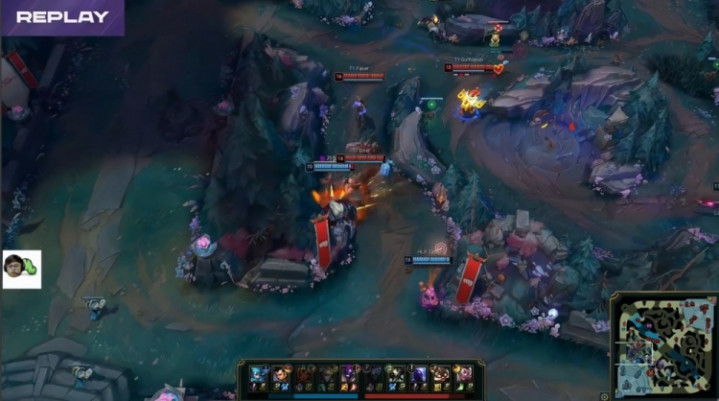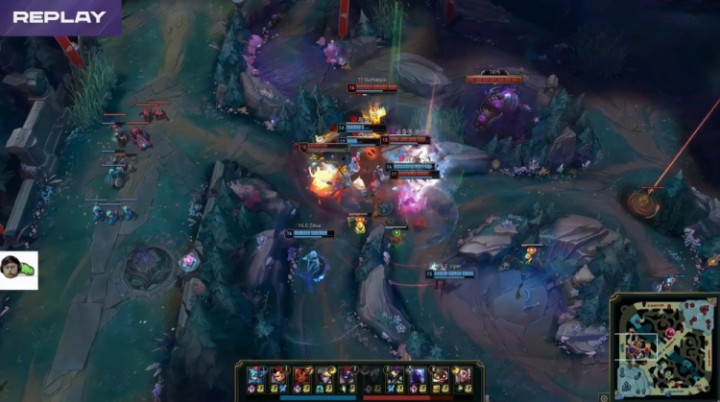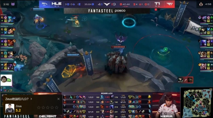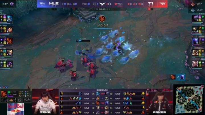 [25:21]Delight牛头没闪没大自家野区逛街被逮,T1回头去开大龙,HLE四人接团,Keria洛卡住河道口,Oner蝎子拿到大龙后落单被Zeka带走,HLE推掉T1中路一塔,经济落后4k。