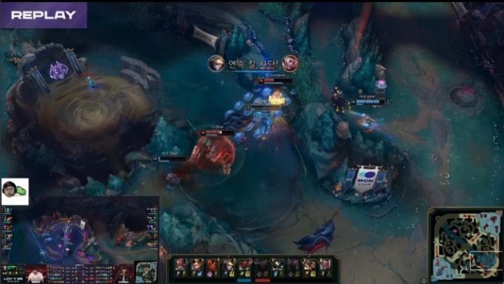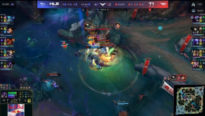 [6:35]小龙团,宙斯格温河道1V3,小花生与Delight想卖宙斯,后者闪现过墙残血拉开,Keria洛先收Zeka,小花生与Delight反手带走T1上中野,HLE打出1换3,经济领先1k。