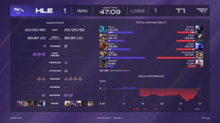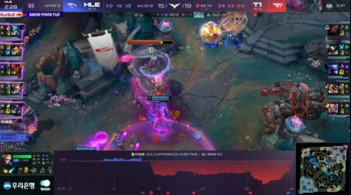 [11:20]Oner蝎子来下,T1三兄弟轻松融化宙斯格温,双方经济差距回到1k之内。