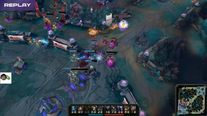 [46:12]HLE中路推进直接冲上T1高地,Delgiht牛头顶回Faker,Viper将其击杀后再杀小吕布,多兰复活1v4遭融,HLE打出1换5团灭T1,一波推平T1基地完成绝地翻盘扳回一城。