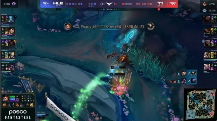 [21:11]小龙团,Oner轻松吃掉小龙,小花生赵信WE冲Oner脸,侧面小吕布被Delight牛头顶回,Zeka拿到小吕布人头,多兰贾克斯进场1v4击杀HLE上辅二人,Zeka岩雀反手击杀多兰,双方打出3换3,HLE经济落后3k。