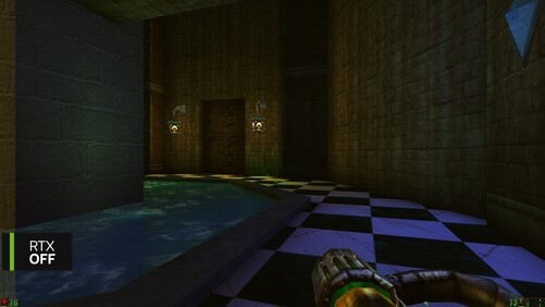 RTXRemix改造了“虚幻(Unreal)”中的异星环境:RTXOFF(左)显示了原始平面外观,而RTXON(右)增加了细节丰富的PBR材质、发光照明和逼真反射。