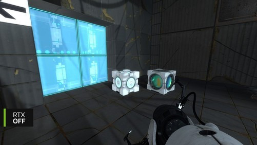 RTXRemix对“传送门2(Portal2)“中的实验室进行锐化处理:RTXOFF(左)显示了原始的平面墙和立方体,而RTXON(右)增加了发光面板、反射图块和逼真的阴影,可呈现更宏大的迷宫式环境。