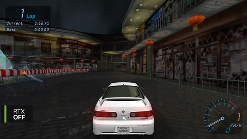 RTXRemix重塑了“极品飞车:地下狂飙(NeedforSpeed:Underground)”中的唐人街:RTXOFF(左)显示了低分辨率纹理和平面光照,而RTXON(右)增加了霓虹灯反射、精细的材质和全路径追踪街道。