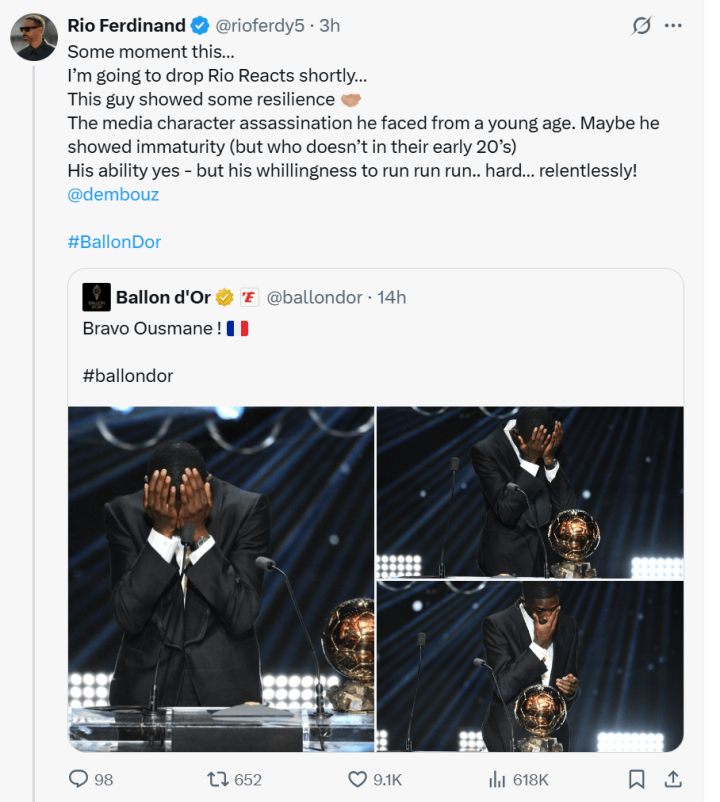 费迪南德在社媒上这样写道:“这一刻好特别啊……我很快就要推出个人节目了……登贝莱这家伙展现出了非凡的韧性,他年纪轻轻就遭遇了媒体的恶意抹黑。或许,登贝莱确实表现出过不成熟,但谁在二十出头的年纪没有过呢。”